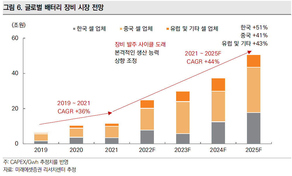 그럼에도 불구하고 글로벌 베터리셀 시장 중에서도 한국 셀 업체에 대응하는 장비 시장의 성장률이 미국 시장의 개화에 맞물려 가장 높을 것으로 판단됨에 따라 장비 발주 사이클에서도 한국 업체들의 두각이 돋보일 것으로 추정됩니다.